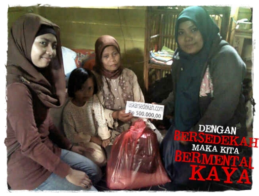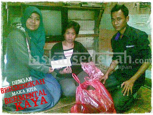 Alhamdulillah, sedekah anda sudah kami sampaikan berupa uang tunai Rp 500,000.- dan paket sembako kepada ibu Kamsiyah seorang janda beranak 3 yang tinggal di Kampung Baru ujung, sehari-harinya bekerja sebagai buruh cuci dengan penghasilan Rp 300,000.-
